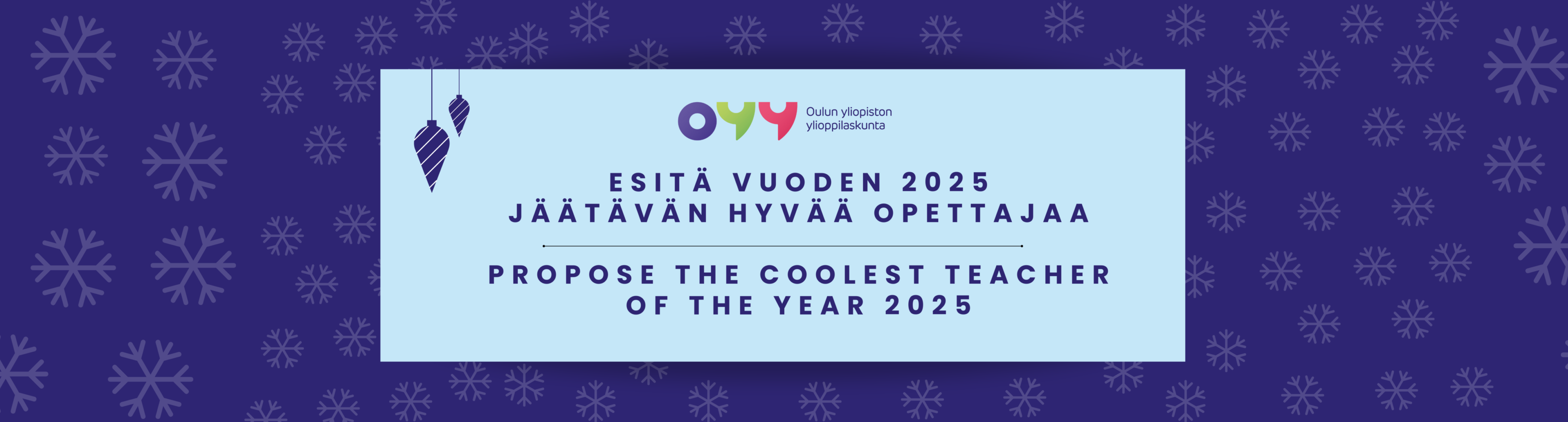 The Student Union of the University of Oulu (OYY) is looking for The Coolest Teacher of 2025. You can nominate any university teacher from any field of study. The Coolest Teacher is someone who is motivated to develop their work and has strong pedagogical skills. They use a diverse range of assessment methods that are systematic, fair, and based on the learning outcomes of the course.